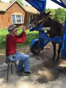 During your horse’s dental evaluation, Dr. Griffin will need to sedate your horse in order to perform the exam and floating. As you can see in the picture above he uses a portable stock and power equipment to perform equine dentistry. The combination of sedation and the stock make the procedure less stressful for your horse and easier on the veterinarian. It also allows for a more thorough evaluation and floating than traditional methods.